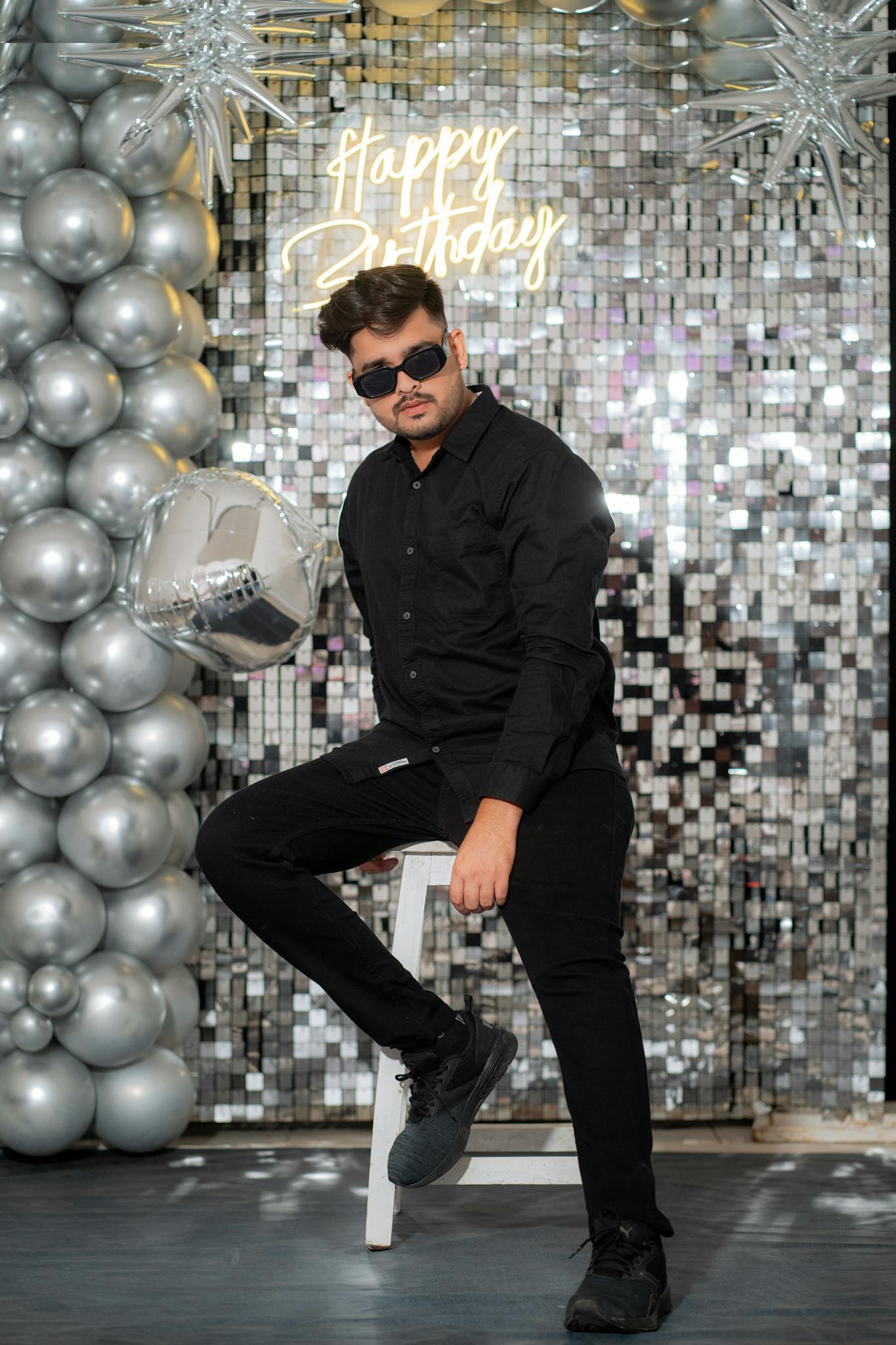 A joyful family birthday party in a modern kitchen with balloons and decorations.